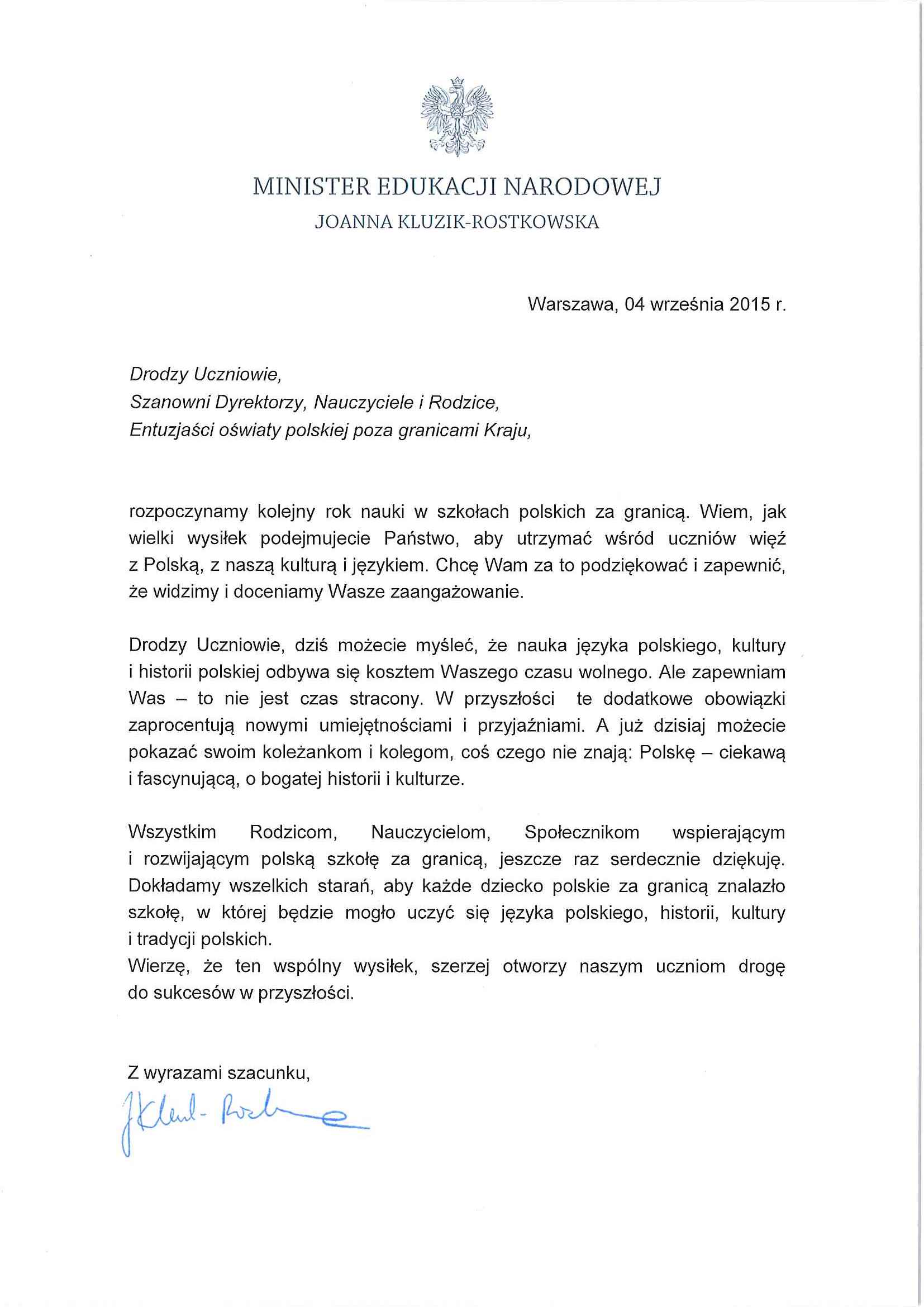 Wszystkim Rodzicom, Nauczycielom, Społecznikom wspierającym i rozwijającym polską szkołę za granicą , jeszcze raz serdecznie dziękuję. Dokładamy wszelkich starań, aby każde dziecko polskie za granicą znalazło szkołę , w której będzie mogło uczyć się języka polskiego, historii, kultury i tradycji polskich. Wierzę, że ten wspólny wysiłek , szerzej otworzy naszym uczniom drogę do sukcesów w przyszłości.