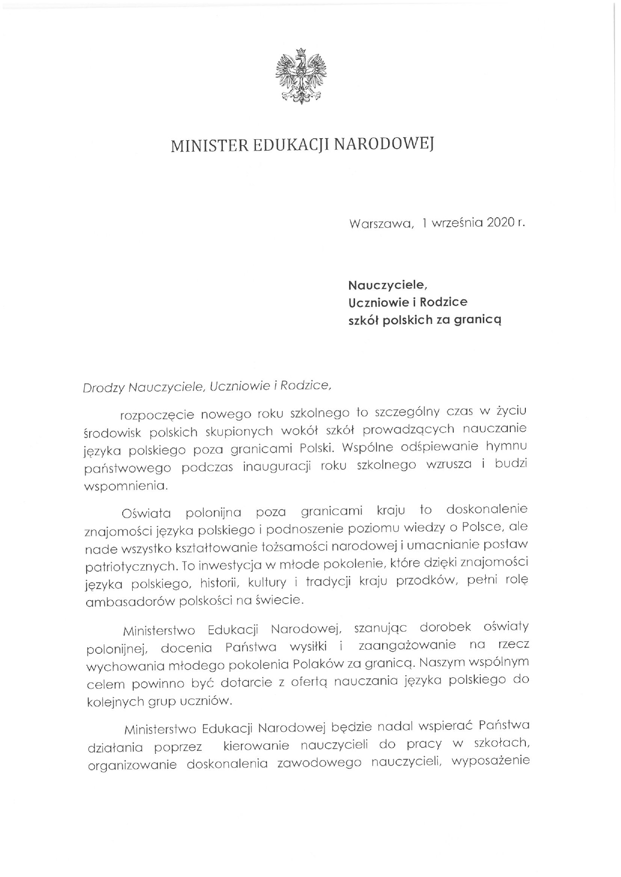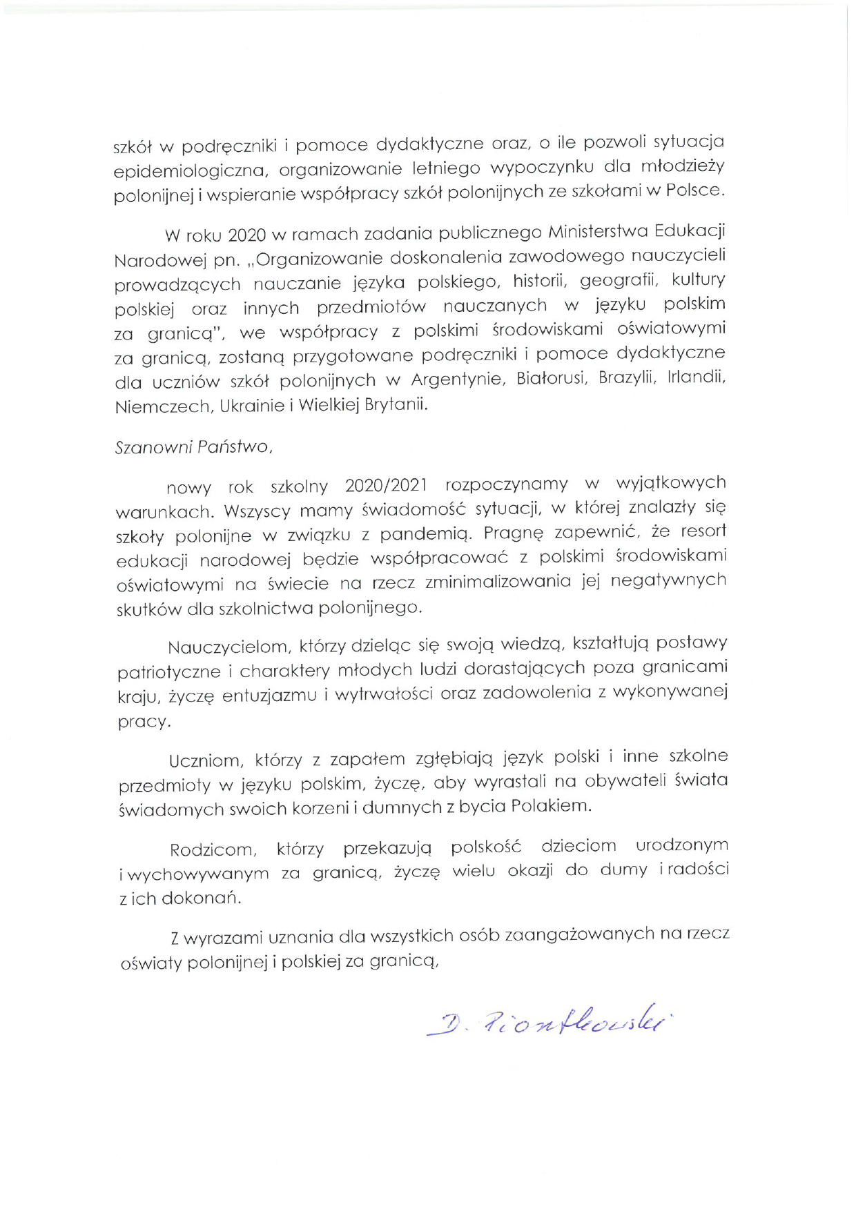 Minister Edukacji Narodowej Dariusz Piontkowski skierował list do uczniów, rodziców, nauczycieli i dyrektorów szkół polonijnych.