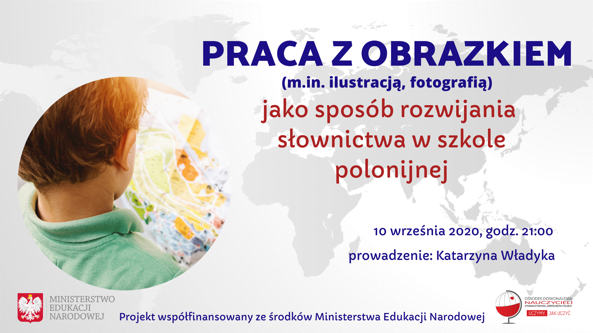 zapraszamy na szkolenie online: „Praca z obrazkiem/ilustracją/fotografią sposobem na rozwijania słownictwa dzieci i młodzieży polonijnej, które odbędzie się w dniu: 10.09.2020r. o godz. 21.00 czasu polskiego (1,5h).