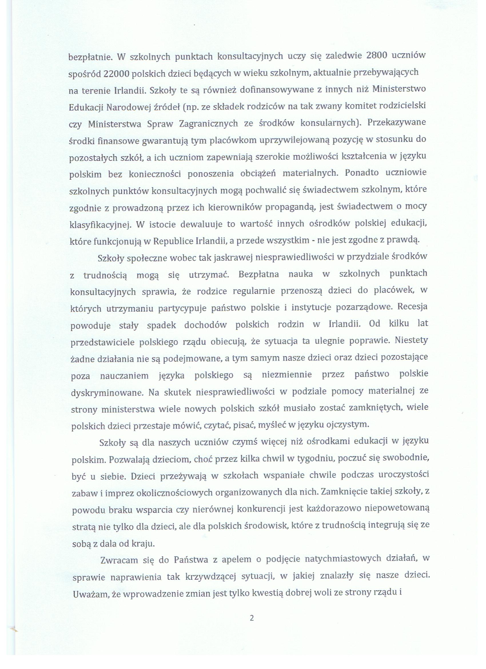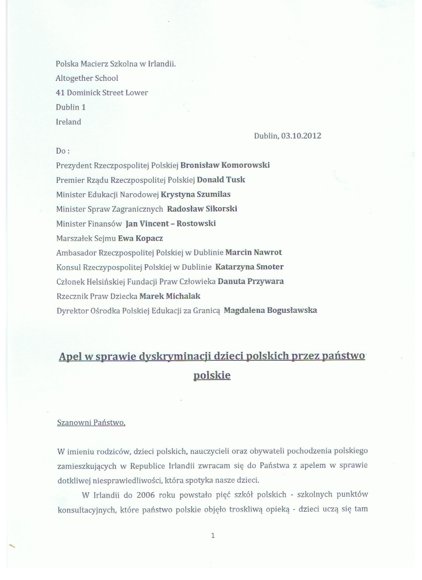 W imieniu rodziców, dzieci polskich, nauczycieli oraz obywateli pochodzenia polskiego zamieszkujących w Republice Irlandii zwracam się do Państwa z apelem w sprawie dotkliwej niesprawiedliwości, która spotyka nasze dzieci.