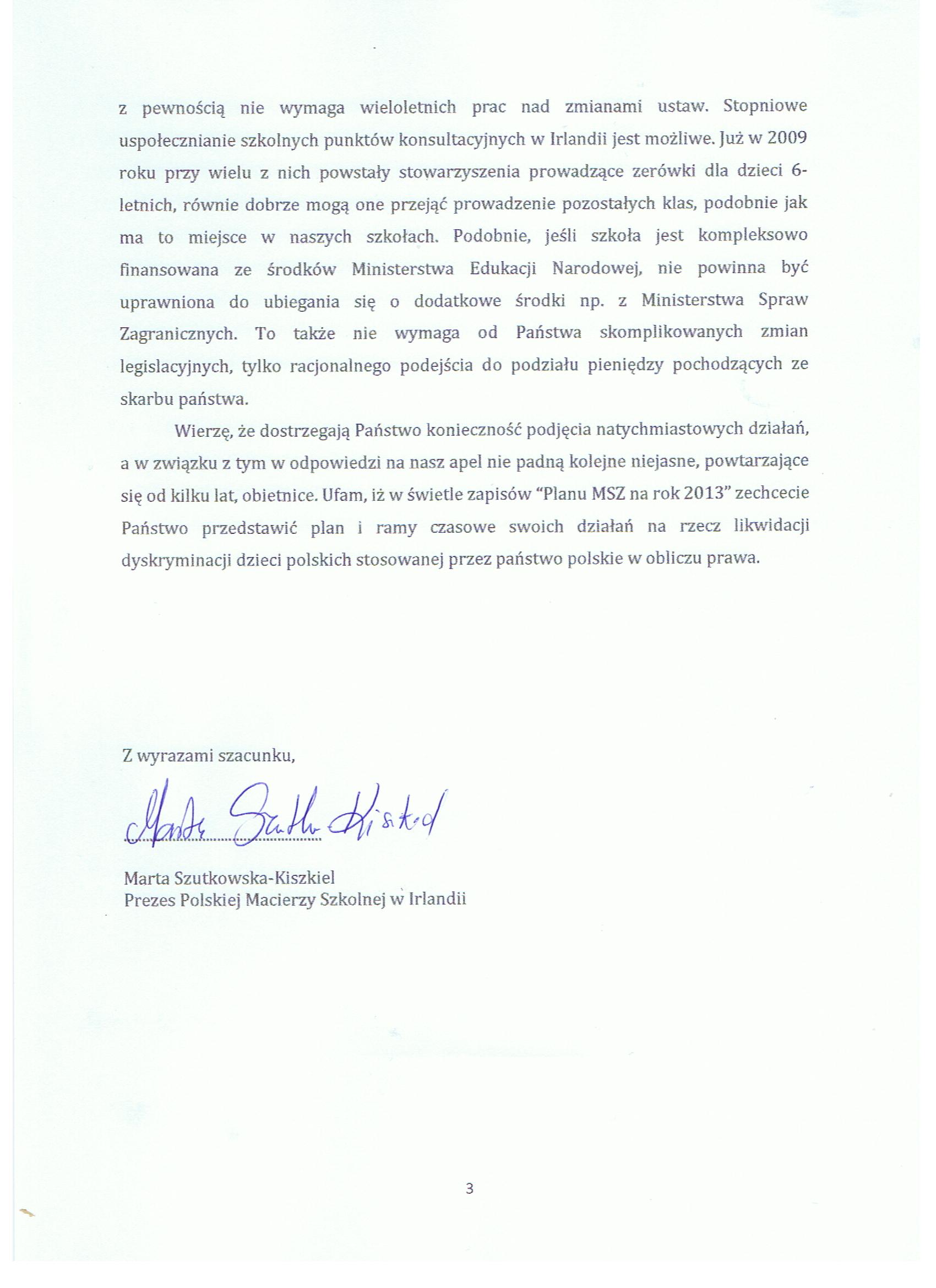 Wierzę, że dostrzegają Państwo konieczność podjęcia natychmiastowych działań, a w związku z tym w odpowiedzi na nasz apel nie padną kolejne niejasne, powtarzające się od kilku lat, obietnice. Ufam, iż w świetle zapisów “Planu MSZ na rok 2013” zechcecie Państwo przedstawić plan i ramy czasowe swoich działań na rzecz likwidacji dyskryminacji dzieci polskich stosowanej przez państwo polskie w obliczu prawa.
