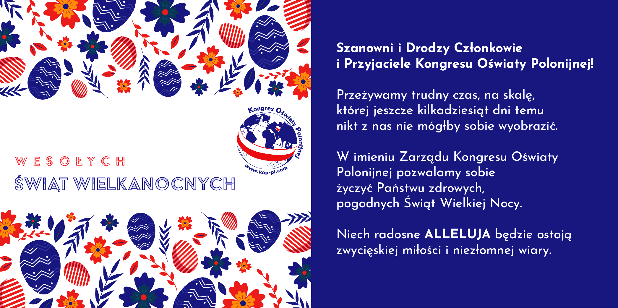 W imieniu Zarządu Kongresu Oświaty Polonijnej pozwalamy sobie życzyć Państwu zdrowych, pogodnych Świąt Wielkiej Nocy.