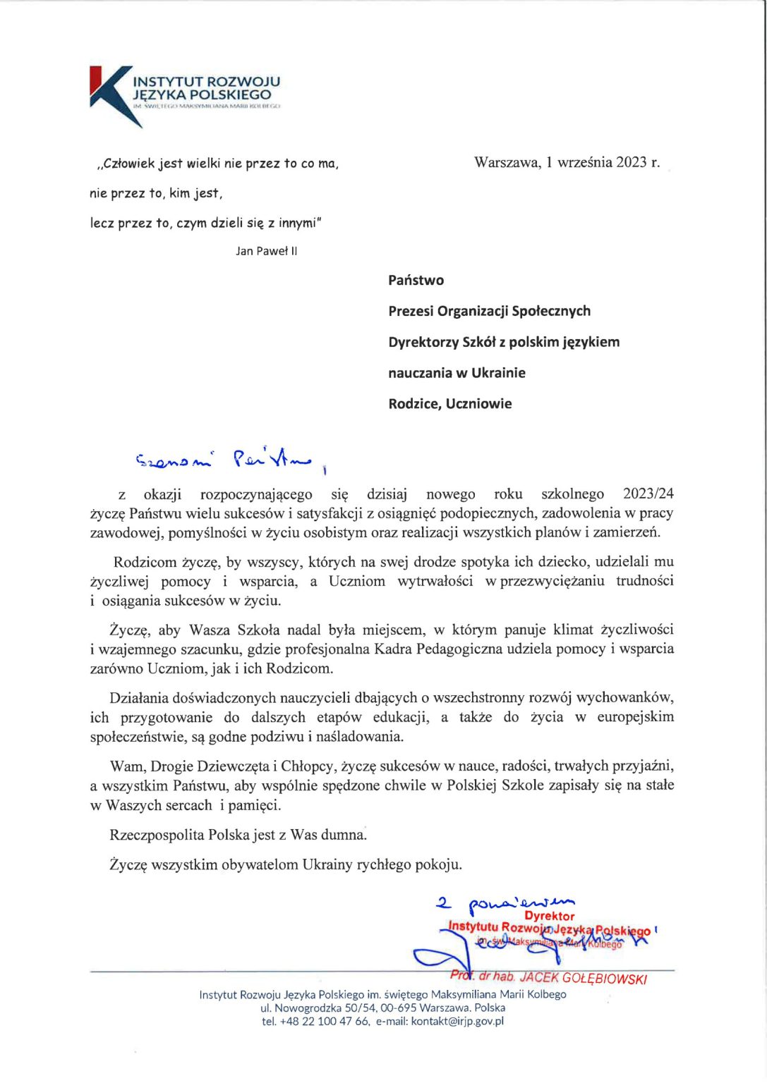 z okazji rozpoczynającego się dzisiaj nowego roku szkolnego 2023/24 życzę Państwu wielu sukcesów i satysfakcji z osiągnięć podopiecznych, zadowolenia w pracy zawodowej, pomyślności w życiu osobistym oraz realizacji wszystkich planów i zamierzeń.