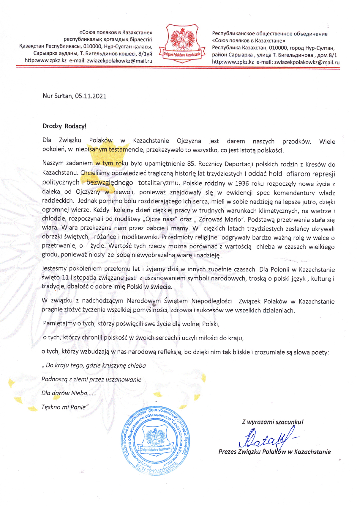 W związku z nadchodzącym Narodowym Świętem Niepodległości Związek Polaków w Kazachstanie pragnie złożyć życzenia wszelkiej pomyślności, zdrowia i sukcesów we wszelkich działaniach.