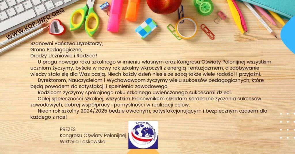 U progu nowego roku szkolnego w imieniu własnym oraz Kongresu Oświaty Polonijnej wszystkim uczniom życzymy, byście w nowy rok szkolny wkroczyli z energią i entuzjazmem, a zdobywanie wiedzy stało się dla Was pasją. Niech każdy dzień niesie ze sobą także wiele radości i przyjaźni.