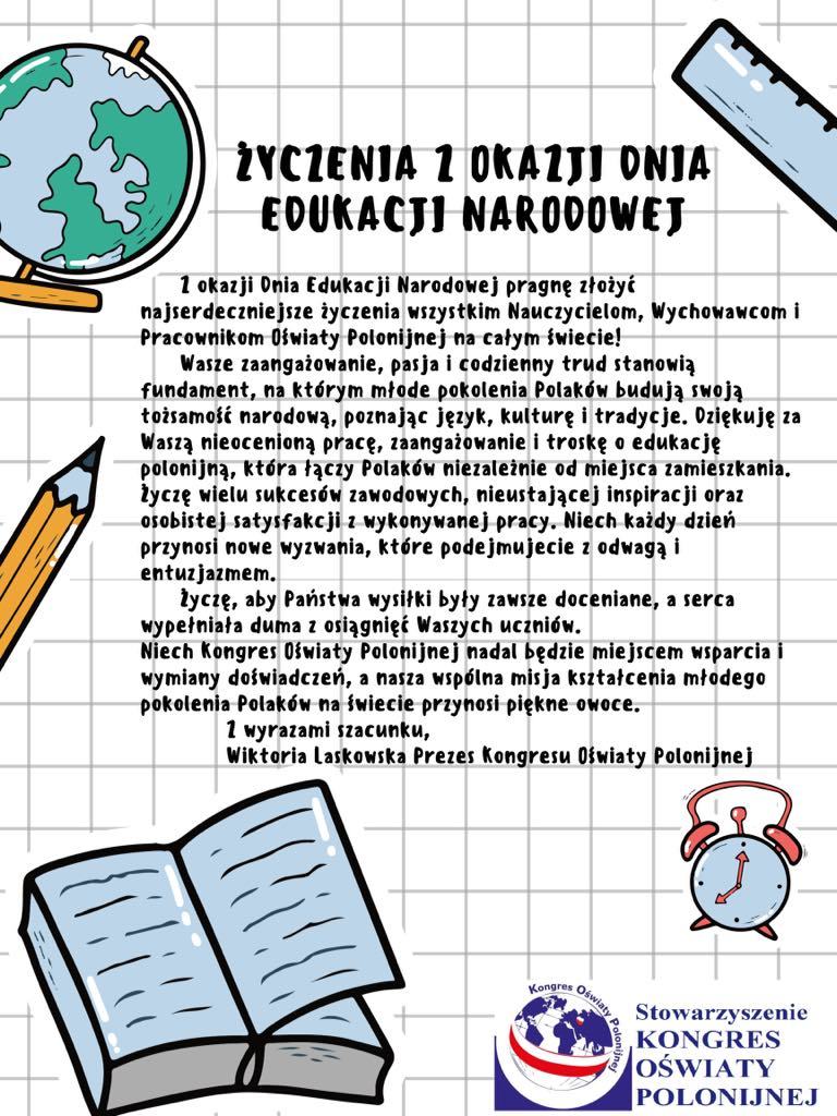 Z okazji Dnia Edukacji Narodowej pragnę złożyć najserdeczniejsze życzenia wszystkim Nauczycielom, Wychowawcom i Pracownikom Oświaty Polonijnej na całym świecie!