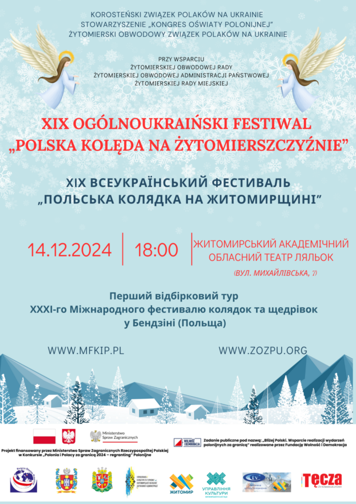 Stowarzyszenie „Kongres Oświaty Polonijnej” oraz Żytomierski Obwodowy Związek Polaków na Ukrainie zaprasza na XIX Ogólnoukraiński Festiwal „Polska Kolęda na Żytomierszczyźnie”.