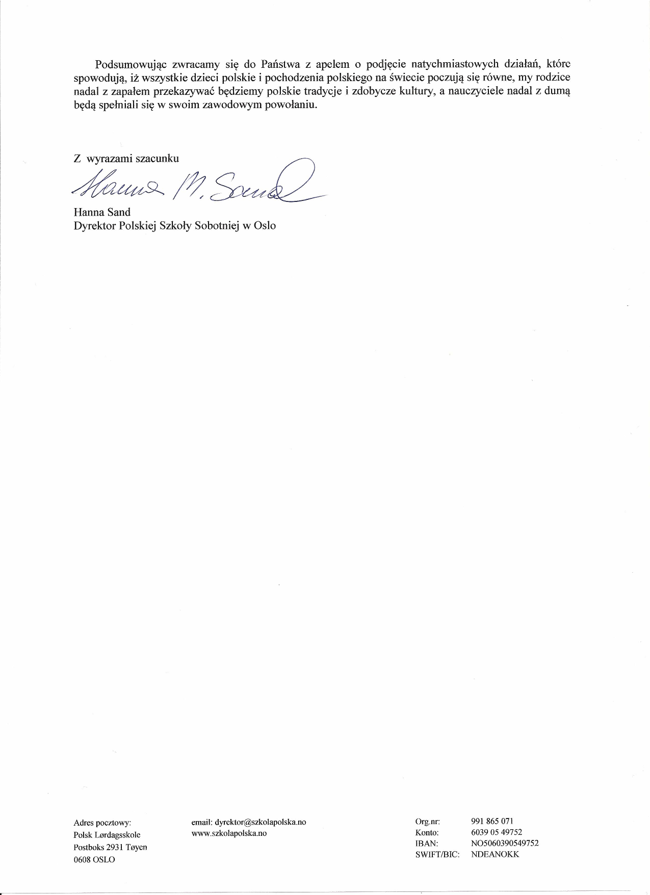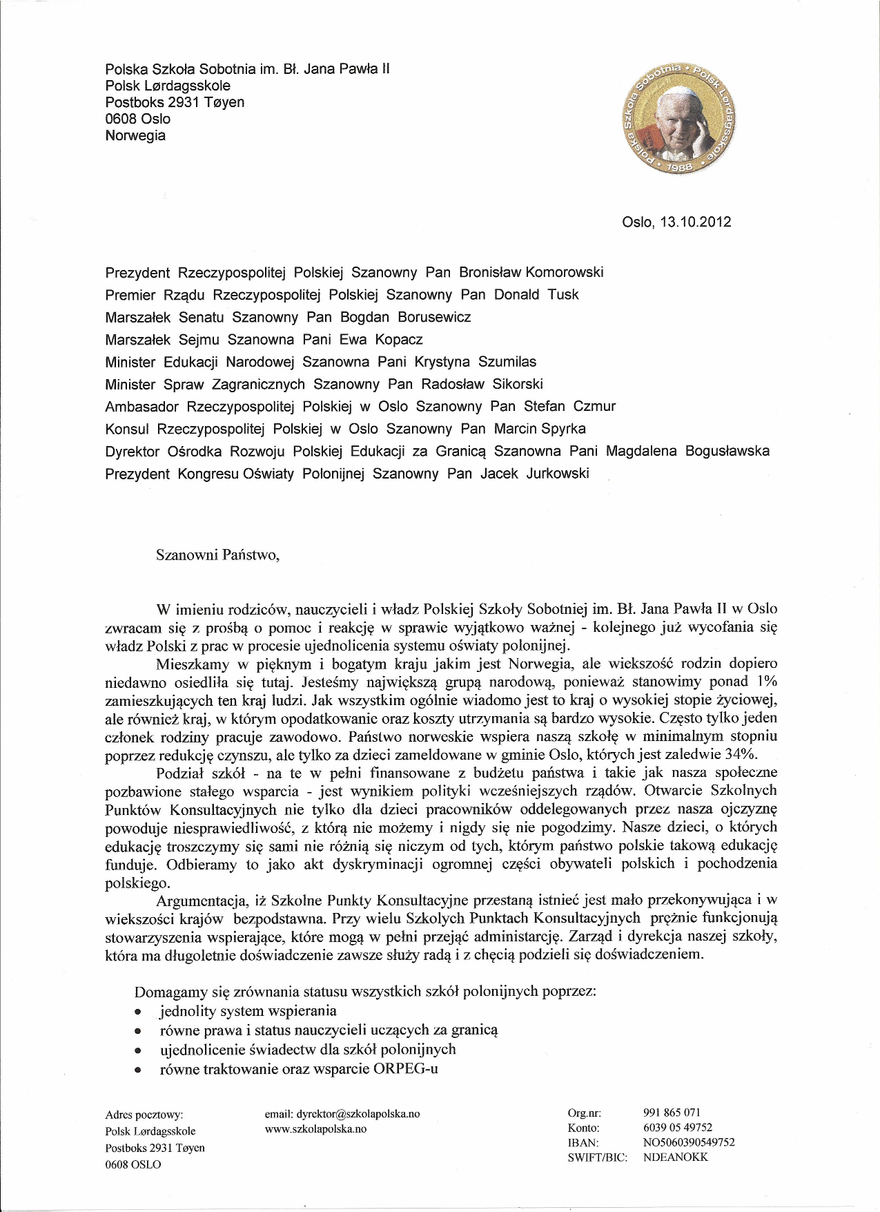 oryginalny dokument Apel Polskiej Szkoly Sobotniej w Oslo 2012