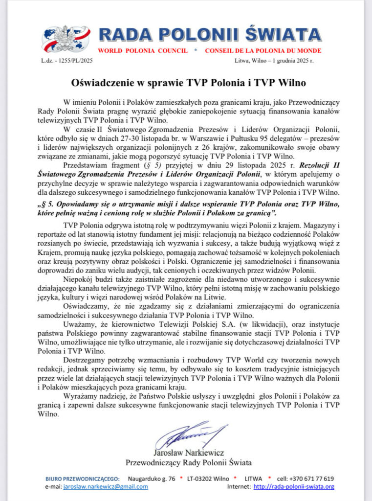 Apel o powstrzymanie degradacji TVP Polonia i przywrócenie audycji polonijnych podpisany przez prezesa Związku Polaków na Litwie Waldemara Tomaszewskiego.