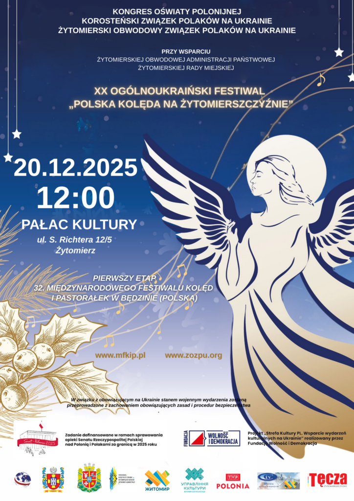 Uroczysty koncert finałowy XX Ogólnoukraińskiego „Festiwalu Polskiej Kolędy na Żytomierszczyźnie” odbędzie się 20 grudnia 2025 roku w Żytomierzu.